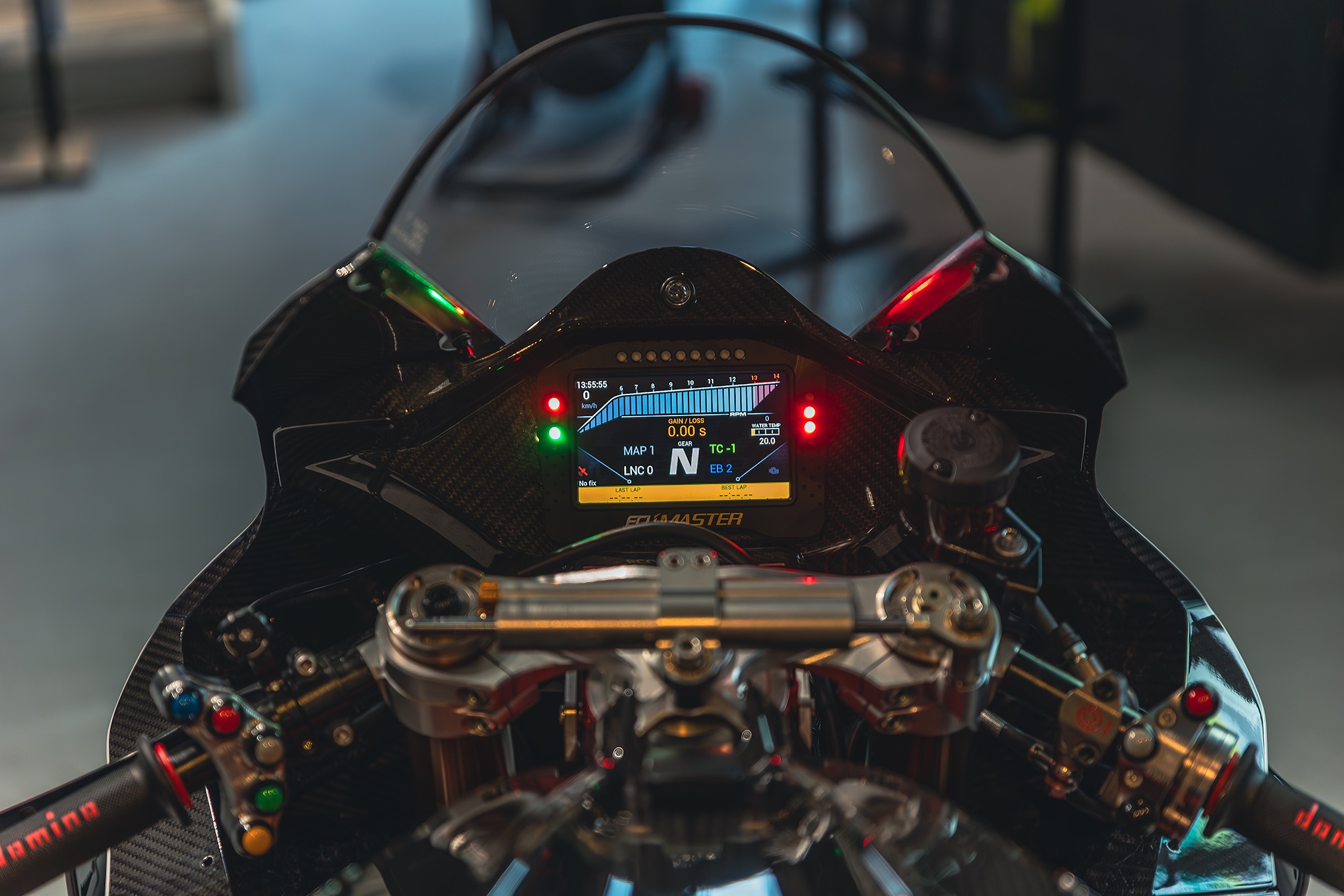• Électronique avancée : ECU Motec M130 avec logiciel WorldSBK, contrôle de traction/patinage/wheelie/lancement réglable, enregistrement complet des données via bus CAN et tableau de bord ADU programmable.