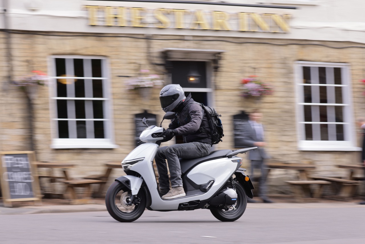 Bon, c’est parti. Il suffit de tourner la clé (pas de système Smart Key), d’appuyer sur le frein, d’appuyer sur le bouton de démarrage et… une icône verte apparaît à gauche sur le tableau de bord, indiquant que le CUV e: est prêt à partir. Chaque pression sur la poignée de gaz – ou plutôt « d’accélérateur » sur un véhicule électrique – est transmise sans délai à la roue arrière. Je sélectionne le mode STD – abréviation de « Standard », même si cela aurait pu être interprété différemment dans cette région – et démarre sans bruit, en sens inverse de la circulation. La dernière création électrique de Honda n’est en effet pas présentée dans un endroit chaud, mais à Oxford. La ville universitaire et pôle de connaissances par excellence au Royaume-Uni, et un clin d’œil appuyé au progrès technologique dont la marque se targue. Aujourd’hui, le programme prévoit donc principalement une circulation urbaine agréable, complétée par un petit bout de routes secondaires entre les deux. Le terrain de jeu prévu pour le CUV e: est donc bien réparti. Dès le départ, je remarque à quel point le CUV e: se faufile avec aisance dans la circulation, grâce à ses roues étroites de 12 pouces (100/90 et 110/90). Mais la réponse bien équilibrée de l’accélérateur, le poids plume (120 kg) et les suspensions assez rigides jouent également un rôle important. Il suffit de regarder pour tourner, sans effort.