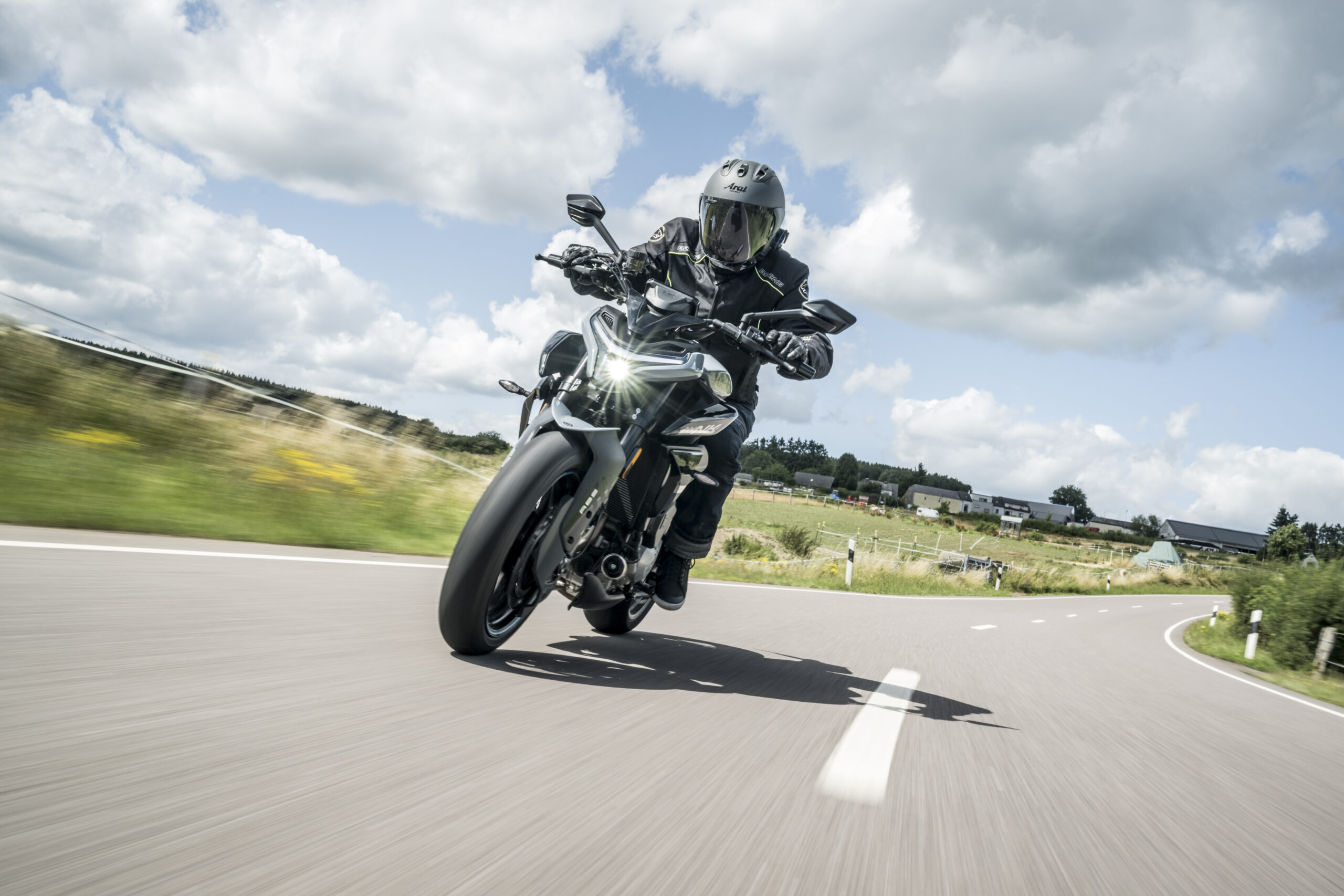 Tâchons d’abord de cerner cette machine avec laquelle nous avons rendez-vous dans l’Ardenne luxembourgeoise au nord du Grand-Duché de Luxembourg. Un cadre idéal pour un galop d’essai de 200 kilomètres sur un réseau routier aussi varié que parfaitement entretenu. Mon enthousiasme grandit encore un peu plus lorsque je découvre la moto. Elle possède un look assez marqué, hérité du bureau Modena 40 basé à Rimini. Ce centre qui s’occupe du design pour CFMOTO est dirigé par l’Espagnol Carlos Solsona. Ce designer a par le passé travaillé pour des marques comme Ducati, MV Agusta, Aprilia ou encore Benelli. Et il a subtilement réussi à donner à cette 675NK sa propre identité, bien qu’elle soit étroitement dérivée de la 675SR-R.