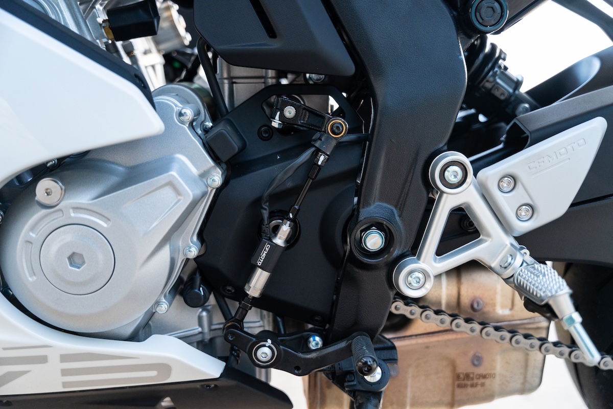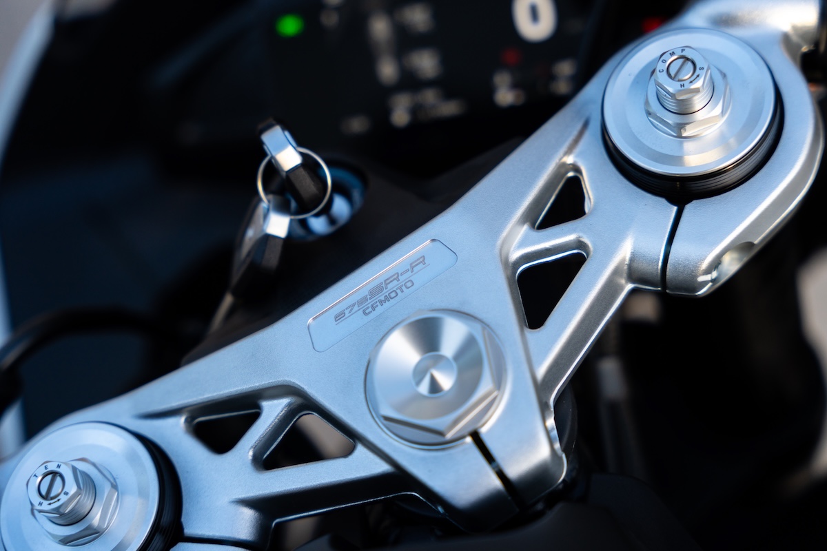 Alors qu’il faut aujourd’hui plusieurs pages pour énumérer tous les systèmes électroniques d’une moto de sport, CFMoto a fait simple avec la 675SR-R. Elle est équipée d’un antipatinage, réglable sur deux modes et désactivable, et d’un quickshifter qui permet uniquement de monter les rapports. En fait, la SR-R est équipée d’une commande par câble de la poignée d’accélérateur, ce qui explique aussi pourquoi il y a si peu d’électronique. Il s’agit d’un choix économique, c’est clair, mais il est tout de même un peu étrange qu’un nouveau moteur destiné à des motos de plus forte cylindrée ne soit pas livré avec une commande ride by wire.