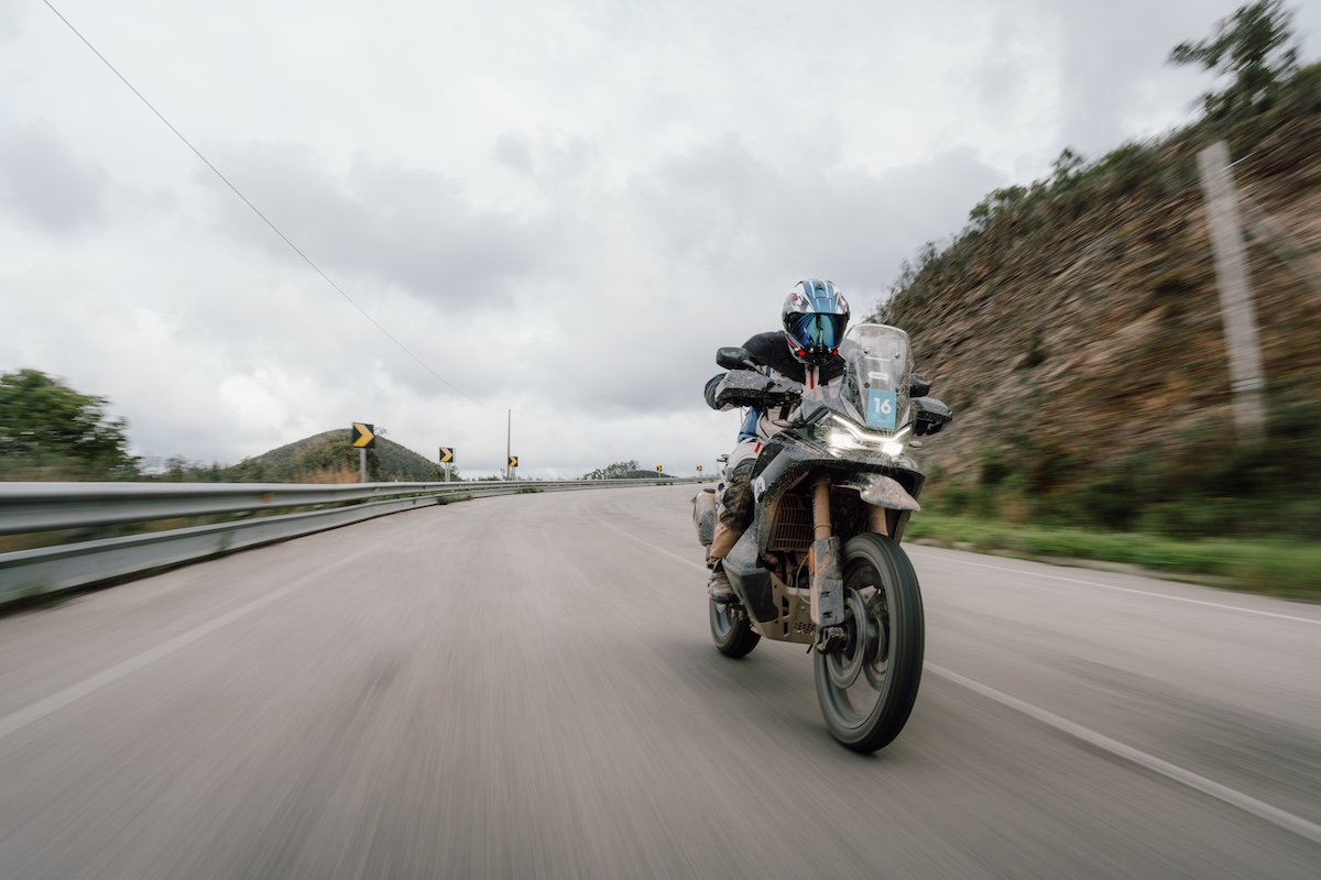 Une fois les tronçons de boue et de gravier passées, nous avons poursuivi notre voyage sur des routes goudronnées. Pour repasser du mode « Offroad » au mode « Standard », il suffit d’appuyer sur le bouton dédié. Rien de plus simple. Sur l’asphalte, la 800MT-X continue de se comporter parfaitement. Elle ne surprend pas, ne fait pas de folies et vous donne confiance en ses capacités. Avec sa roue avant de 21 pouces et ses pneus tout-terrain, elle n’est évidemment pas ce qu’il y a de mieux pour le bitume. Et vous ne la pousserez pas à l’extrème dans les virages. Pour un usage purement routier, mieux vaut opter pour une 800MT Sport ou Explore. Celles-ci sont faites pour ça, alors gardez cela à l’esprit si la MT-X tente de vous séduire avec son look d’aventurière endurcie. Le bicylindre de 799 cm3 développe 91 ch et 86 Nm, et il est enfin possible de l’exploiter. Je connais le moteur KTM, et je sais donc à quoi m’attendre : beaucoup de puissance en bas et une poussée sans fin jusqu’à la zone rouge. La 800MT-X est puissante, plus que ce à quoi on s’attendrait. On ne s’ennuie donc jamais. Pendant ce temps, la température des pneus est de 29° Celsius à l’avant et de 34° à l’arrière…