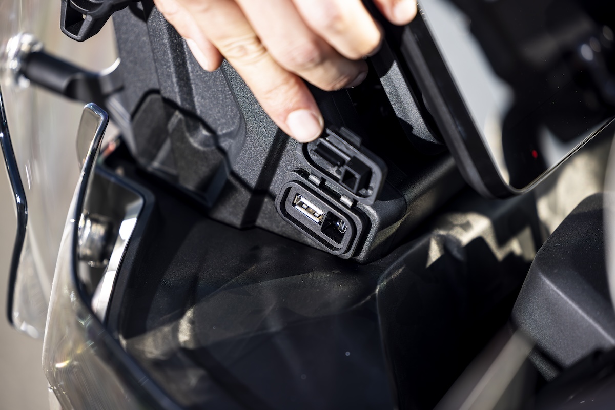 Plus pratique encore, le pare-brise peut être réglé manuellement, à l’aide de deux molettes tournantes. Un système simple, rapide et donc parfait. Autre élément intéressant, une connexion USB-A et USB-C, bien cachée sous le tableau de bord. Toutes les motos devraient en être équipées. Ou encore la clé qui permet également de régler les suspensions, à l’avant comme à l’arrière. Nous avons déjà vu cela sur d’autres motos, et vous n’avez plus besoin d’un tournevis. Et pourquoi pas un indicateur de pression des pneus ? Toujours intéressant. CFMoto va même plus loin en ajoutant une jauge de température. En dehors d’une utilisation sur circuit, où vous n’irez évidemment pas avec la 800MT-X, nous n’en voyons pas l’intérêt. Quoi qu’il en soit, l’information est intéressante.