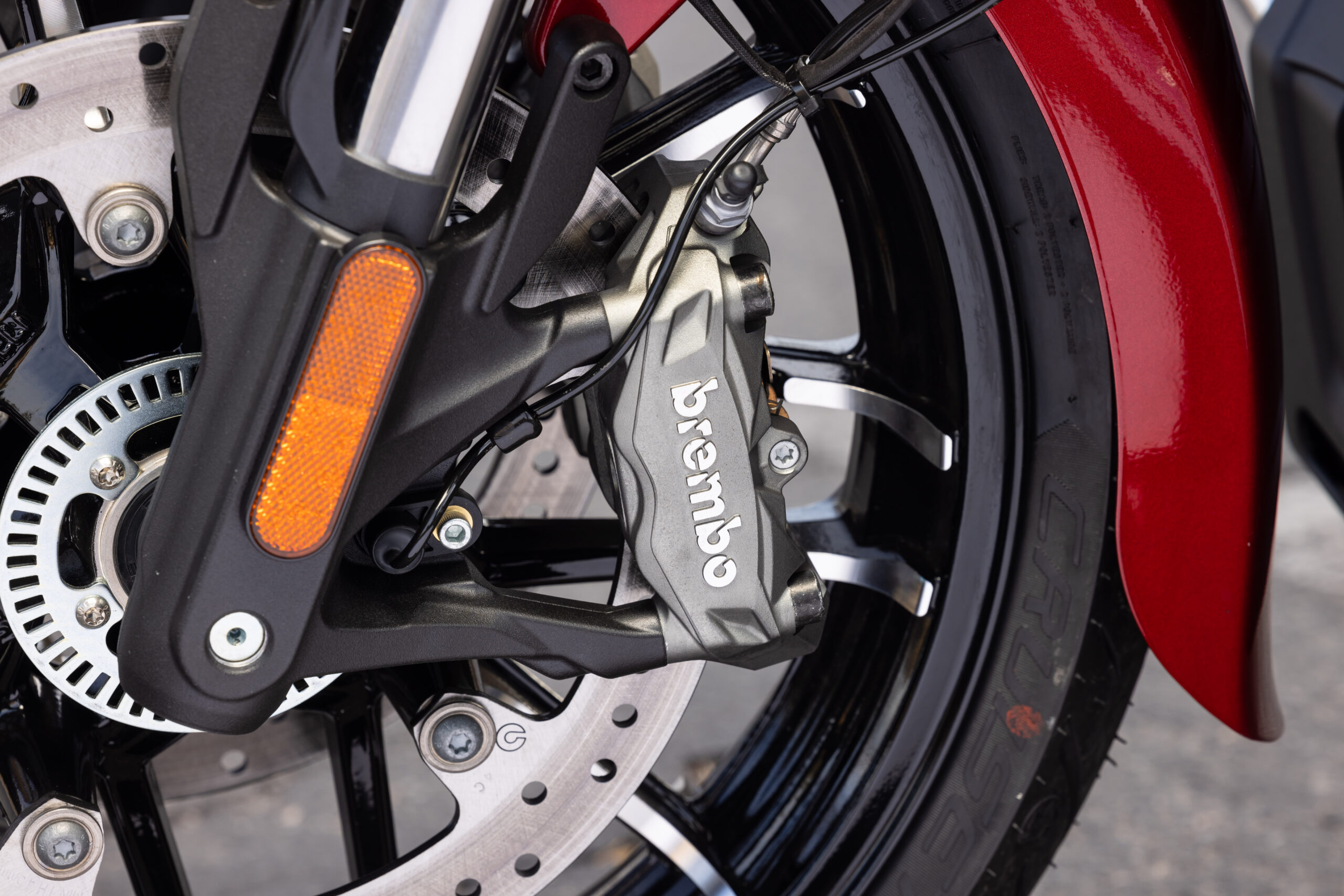 Il en va de même pour les freins. Qui fonctionnent sans doute beaucoup mieux que ceux d’une Dodge Challenger de 1970. Peut-être qu’avec l’Indian et ses Brembos radiaux, Kowalski aurait pu s’arrêter à temps face aux bulldozers. Du moins, s’il l’avait voulu… Là encore, tout est contrôlé électroniquement à la perfection et, bien sûr, sensible à l’inclinaison. Les freins sont désormais tous connectés entre eux, de sorte que l’IMU recherche toujours la meilleure répartition de freinage entre l’avant et l’arrière, et si nécessaire, en côte vous pouvez bloquer les freins pendant trois minutes.