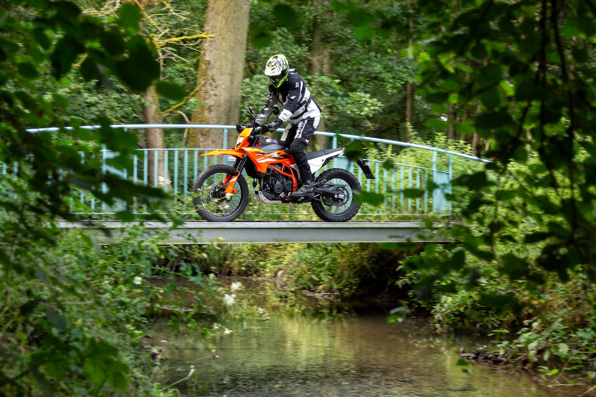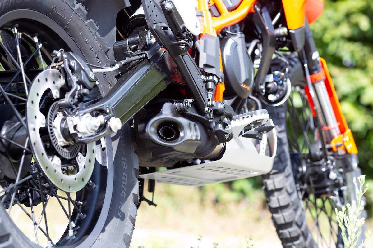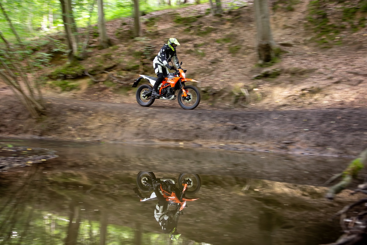 Le monocylindre est assez souple, mais certainement pas excitant. Même à haut régime. Il s’agit donc d’un moteur KTM atypique. Vous disposez de suffisamment de puissance pour accélérer facilement partout, mais vous ne serez jamais surpris. Et c’est une bonne chose pour ce type de moto. Bravo à KTM. Ce qui frappe, ou plutôt ce qui manque, c’est le bruit à l’échappement. Le petit pot d’échappement sous le bloc moteur est bien dissimulé, mais aussi bien étouffé. Un bruit faible et sans inspiration. Mais cela a aussi son avantage, car cela empêche de faire trop de bruit dans la forêt. Lors de la séance photo, nous n’avons reçu aucun regard noir de la part des promeneurs et des cyclistes qui passaient. C’est aussi agréable parfois…