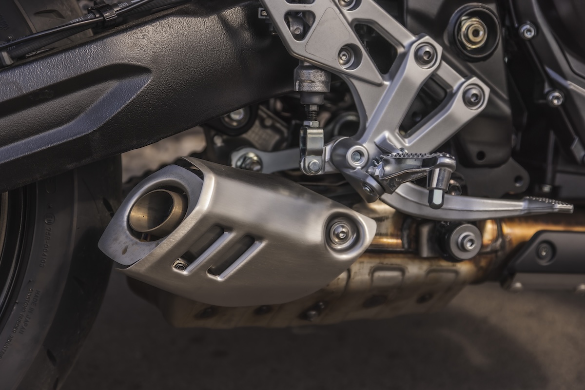 L’alimentation de ce nouveau phare, entre autre, provient d’une toute nouvelle batterie lithium-ion. Celle-ci est plus petite, plus légère, plus résistante, se charge plus rapidement et conserve l’énergie plus longtemps que la batterie plomb-acide de la S. De plus, sur la T, nous remarquons un nouveau logo 8-ball sur les petits caches latéraux, c’est joli. L’échappement court bénéficie également d’un design légèrement différent. Le résultat donne une machine soignée, mais qui n’a rien de spéciale non plus. Elle est plutôt… banale et bien élevée. Cela est dû en partie aux trois variantes de couleurs ternes (noir, vert-gris et beige-brun) qui ne lui confèrent pas un look immédiatement éblouissant.