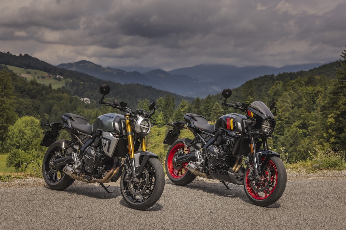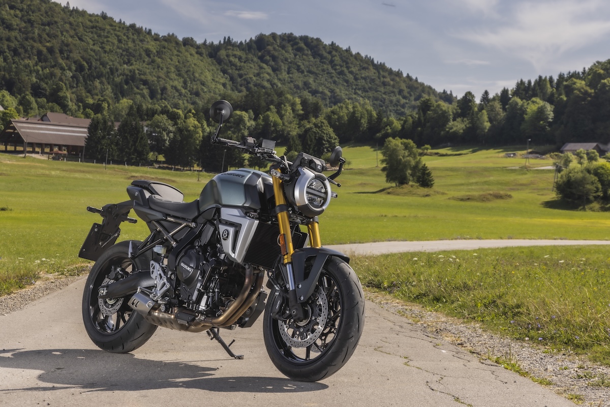 La Slovénie. Le paradis de la moto. Il est rare d’y trouver une ligne droite et on a souvent mal au cou et à la mâchoire à force de regarder autour de soi en se disant « ooh » et « aah ». À explorer sans aucune modération. Mais nous ne sommes pas ici pour jouer les touristes et passer en revue le pays, mais plutôt pour tester les Suzuki GSX-8T et TT. La marque japonaise a cru bon de décliner une version néo-rétro de la GSX-8S. Enfin plutôt deux, qui sont assez proches en terme de cadre, bloc moteur, suspension, réglages de suspension, roues, freins, guidon, électronique… En d’autres termes, on peut affirmer que ce sont des GSX-8S avec un look différent. Est-ce une mauvaise chose ? Pas du tout. La S est une moto particulièrement bien conçue, il n’est donc pas nécessaire de la modifier inutilement pour faire la différence. Ce qui change, en revanche, c’est le réservoir d’essence. Non seulement il arbore un design plus rétro, mais il est possède un volume plus grand de 2,5 litres que le réservoir de 14 litres de la S.