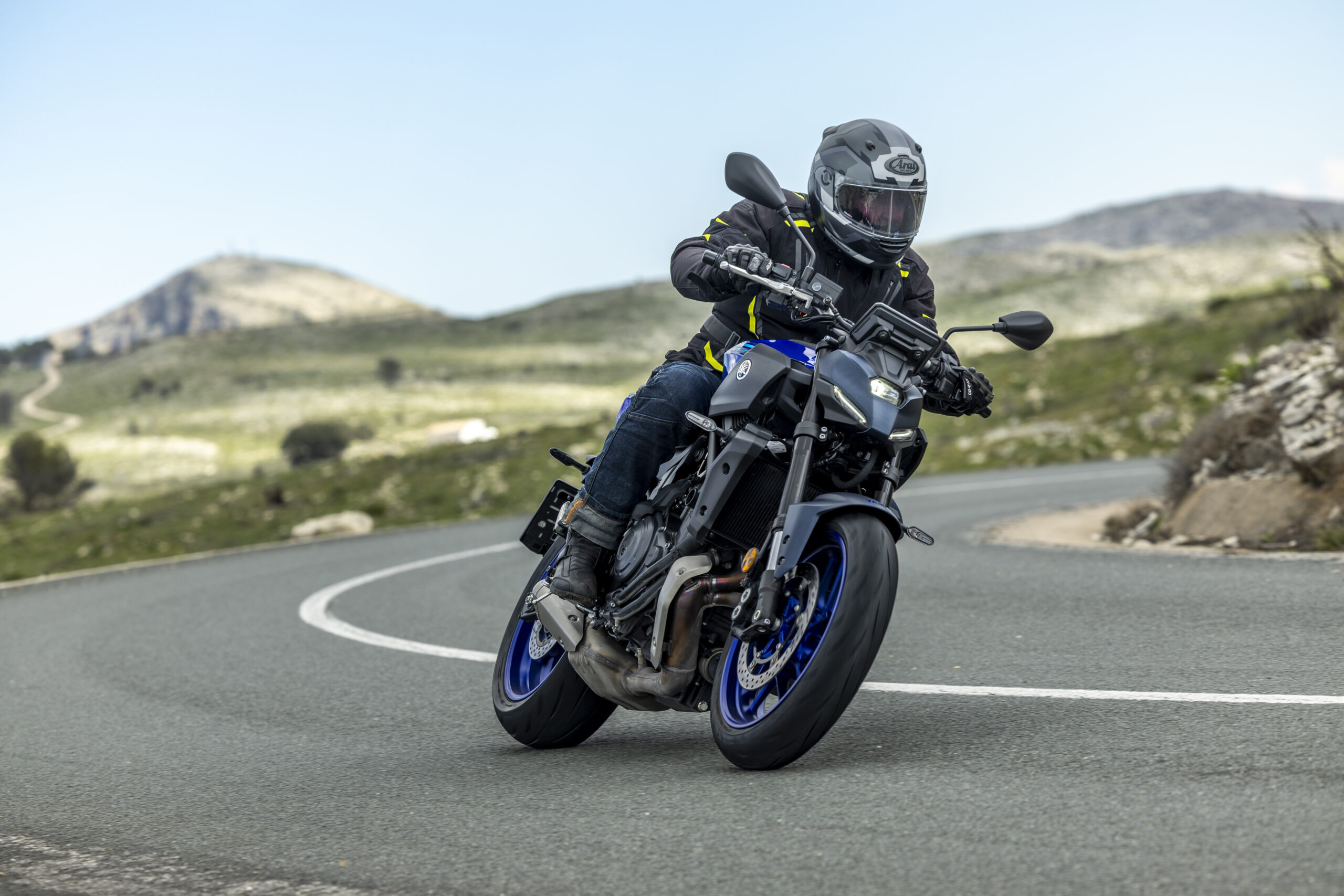 Les premières séries de virage arrivent, je passe en mode Sport. Comme attendu, la réponse à la poignée de gaz est plus directe et je profite pleinement de la nouvelle géométrie de la MT-07. L’empattement est légèrement plus court de 5 mm avec un angle de chasse passant de 24,8 à 24,3 degrés tandis que la chasse gagne 3 mm (de 90 à 93 mm). Ces valeurs semblent faibles dans l’absolu mais elles jouent inévitablement sur le comportement de la machine, qui gagne dans ce cas en maniabilité. En même temps, la stabilité à grande vitesse ne perd rien de sa superbe. Les grandes courbes s’enchaînent tambour battant. Les pneumatiques Dunlop Sportmax Q5A tiennent également leur rang. Le CP2 tracte de manière continue et la partie-cycle suit sans broncher. Les freinages plus appuyés sur l’avant sont toujours contrôlables en toute circonstance.