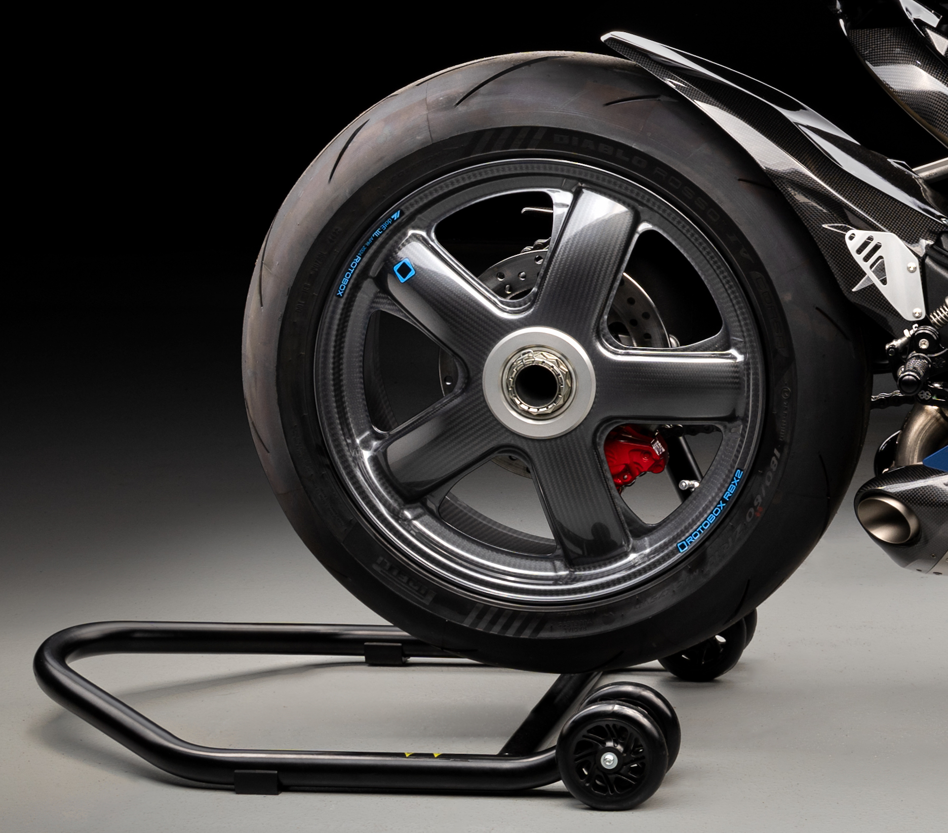 Il est grand temps de sortir la balance. Car il est possible d’économiser des grammes et des kilos sur un certain nombre d’éléments. Prenons par exemple la ligne d’échappement : celle de série pèse 13,9 kg, tandis que la nouvelle ligne Akrapovic en titane ne pèse au total que 6,3 kg. Y compris le double silencieux OEM Ducati Performance/Akrapovic. Comme un filtre et une cartographie personnalisés sont inclus, vous conservez également la garantie, malgré les modifications. Les jantes Rotobox RBX2 à cinq branches ne se contentent pas de réduire l’inertie et d’alléger la tenue de route, elles font également un clin d’œil aux jantes à cinq branches d’origine de la RS2 d’antan, ainsi qu’aux jantes de la RS6 Hommage. Un coup double.