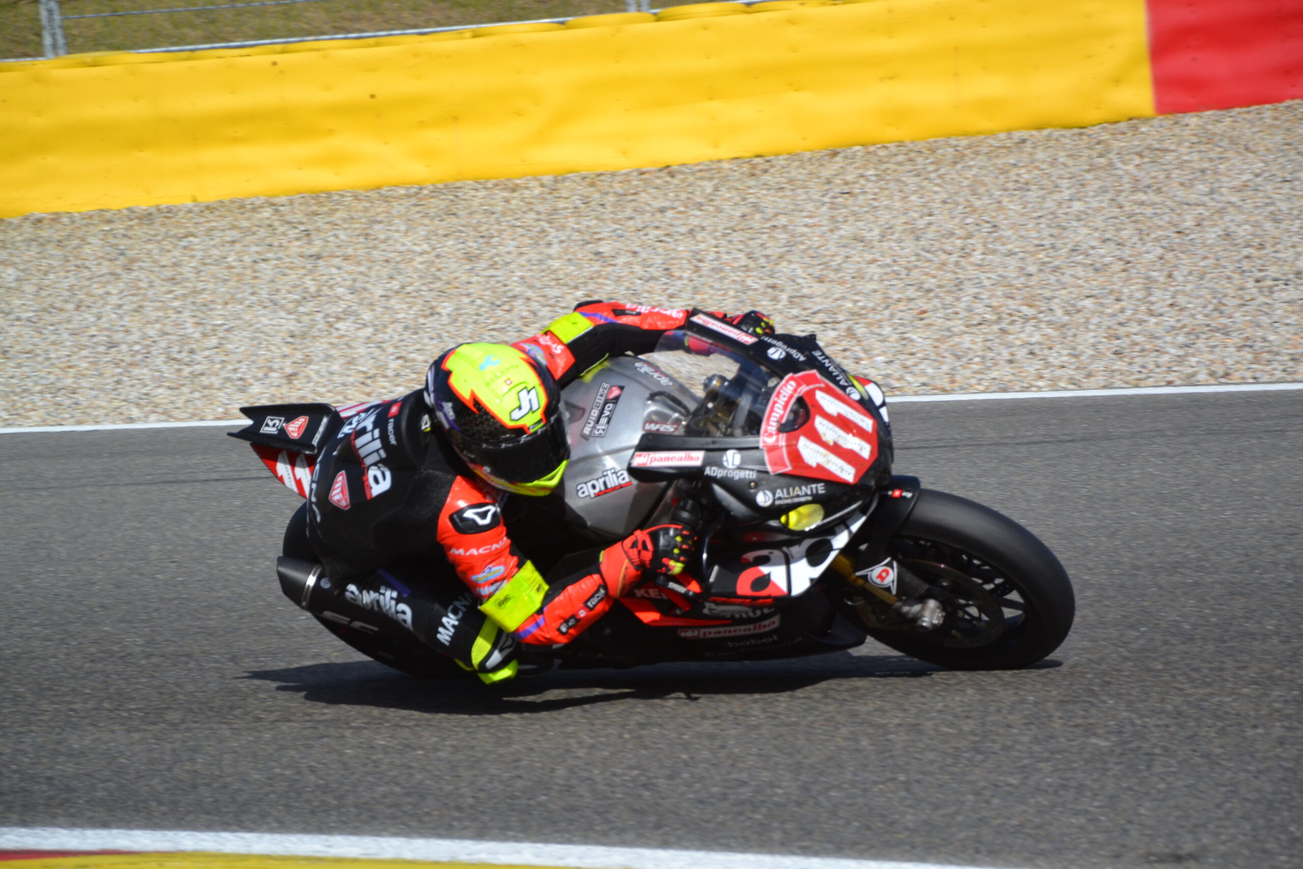 Mention particulière à la seule moto italienne engagée, l’Aprilia RSV4 1100 pilotée par Kevin Calia et Luca Bernardi – ici en action – qui terminera 7ème au général et surtout victorieuse en SST.