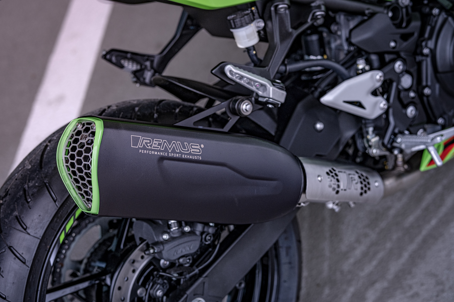 Bien que les Z500 SE et Ninja 500 SE soient déjà très complètes de série, il est toujours possible d’y apporter une touche personnelle et d’améliorer leurs performances. Outre le silencieux Akrapovic en titane, un superbe silencieux REMUS NXT est désormais disponible pour ces machines. Cet échappement en acier inoxydable est léger (- 800 grammes par rapport à l’échappement de série) et dispense une sonorité plus profonde. Il est doté d’une protection dans sa partie arrière, d’un bouclier thermique et d’un anneau de couleur au niveau de l’embout. Cet anneau existe en vert et en argenté pour s’harmoniser parfaitement avec la couleur de la moto. Ces deux silencieux sont conformes à la norme Euro5+ et son homologués ECE.
